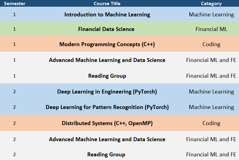 The KABFI PhD Course Portfolio is a full-time, two-semester training plan that builds rigorous foundations in machine learning, deep learning, financial data science, and modern software systems. All courses are mandatory and open to KABFI PhD students. Financial Data Science may admit non-KABFI students (subject to prerequisites and space).